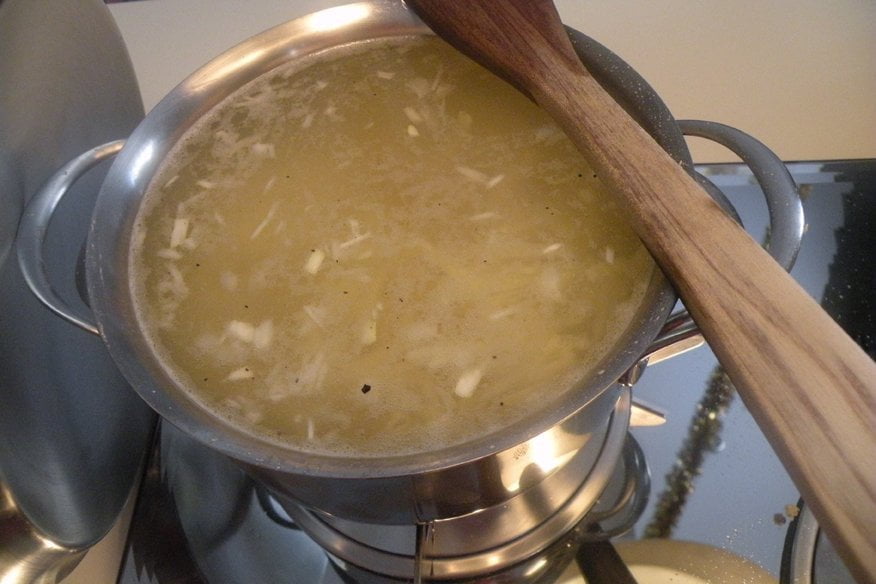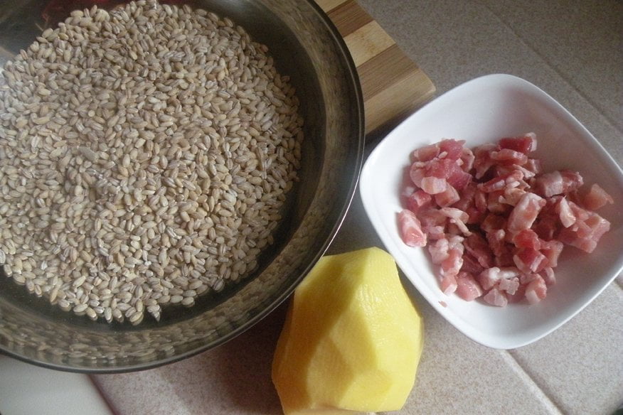 Ingredienti per 4 persone: 200g di orzo perlato, 100 di pancetta a dadini, una patata media finemente tritata, un dado per brodo, due litri d’acqua, sale e pepe.