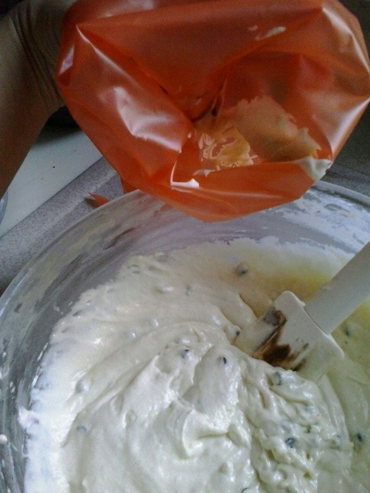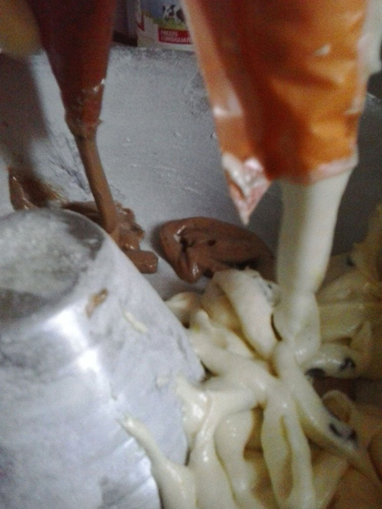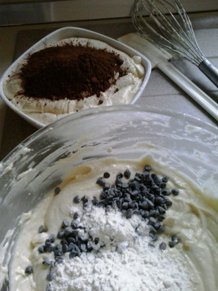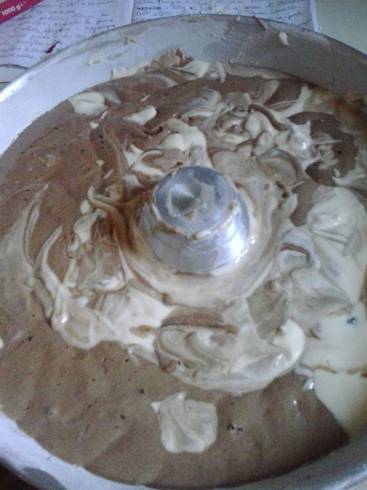 Cominciate con il montare il burro ammorbidito con lo zucchero, una volta montati aggiungete le uova incorporandole uno alla volta. Appena tutte le uova saranno amalgamate, grattugiate la scorza del limone o se preferite dell’arancia che si sposa bene col cacao. In una ciotola setacciate la farina e il lievito e poi mettetene da parte 45g. Tutta la farina rimanente aggiungetela all’impasto. Chiaramente non in una volta sola, incorporatene poco per volta e quando avvertirete l’impasto un po’ duro da lavorare con la frusta, intervallate con il latte, infine il pizzico di sale. Quando il tutto sarà ben amalgamato, dividere il composto in due ciotole (circa 740g ciascuna), unire in una parte i 45g di farina precedentemente messi da parte con le gocce di cioccolato e nell’altra il cacao amaro. Mescolate bene le singole parti e porle all’interno di due sac à poche. Intanto imburrate e infarinate uno stampo per ciambella e distribuite contemporaneamente il contenuto dei due sac à poche. Ora, se non volete avere l’80% dell’impasto sulle mani e altrove, riempite poco alla volta le sacche, così da avere un controllo maggiore e soprattutto avrete ordine pulito.
