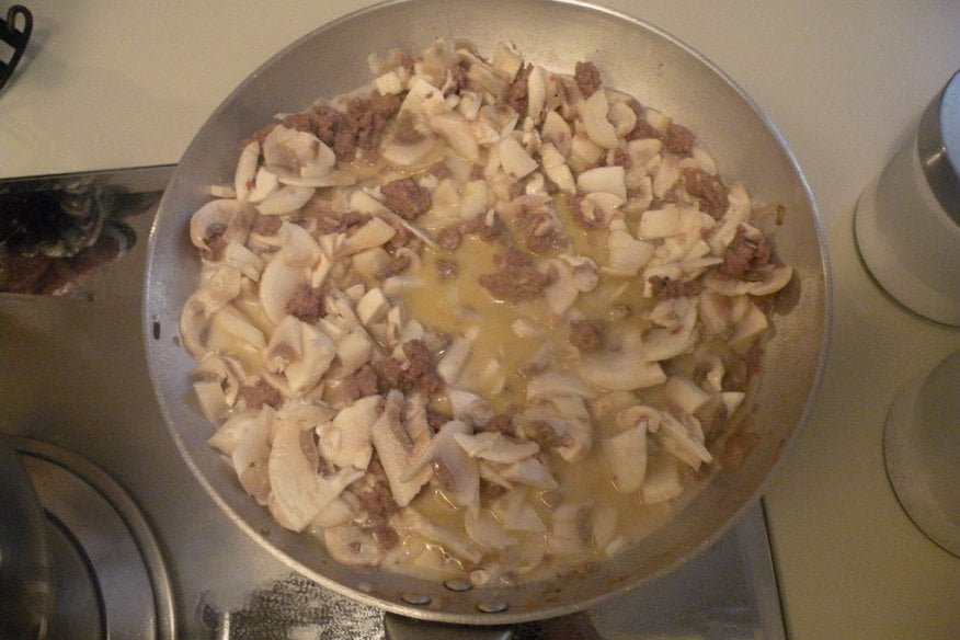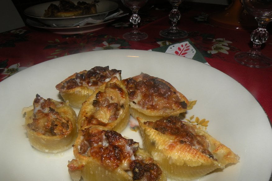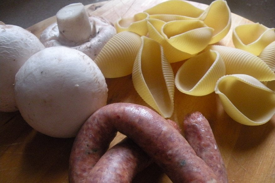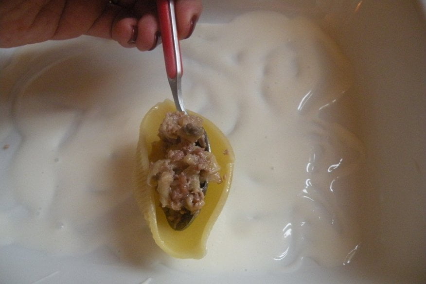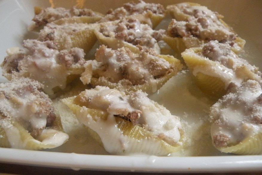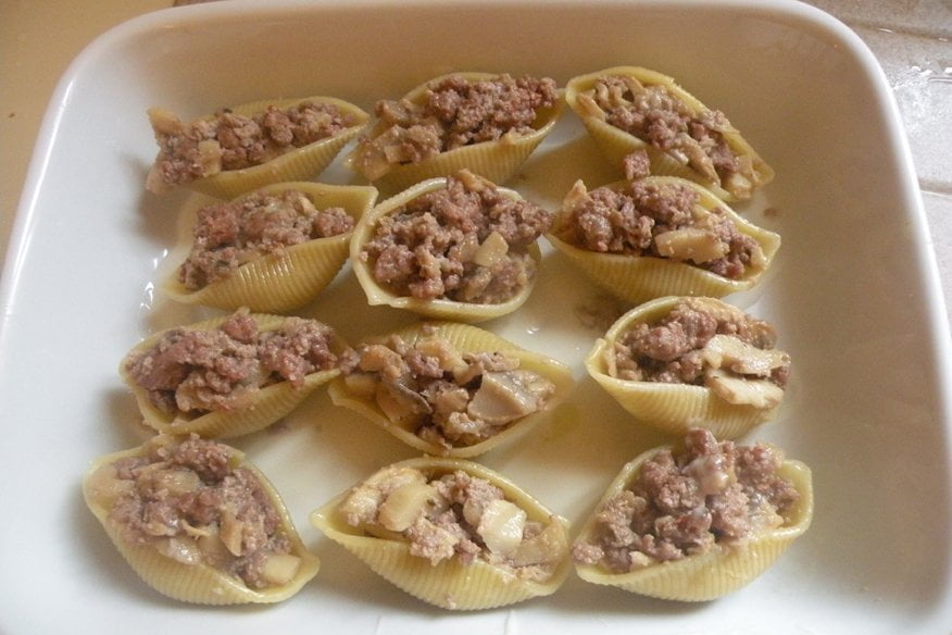 Ingredienti per 2 persone: 100g di conchiglioni grandi (all’incirca 12), 200g funghi champignon, 200g di salsiccia di vitello, 1 bicchiere abbondante di latte, ½ bicchiere di vino rosso, 1 cipolla media, 100ml di besciamella (diluita con un po’ di latte), 2 cucchiai parmigiano, olio, sale, pepe.