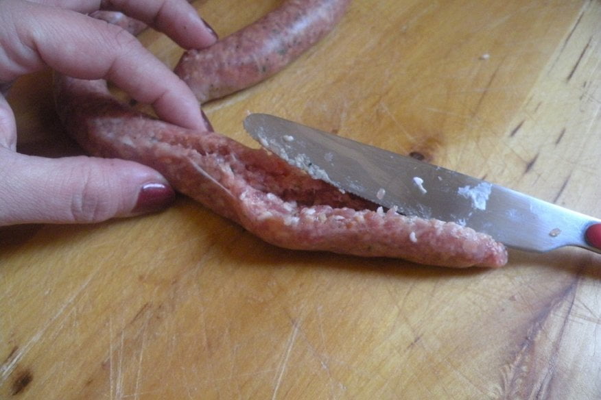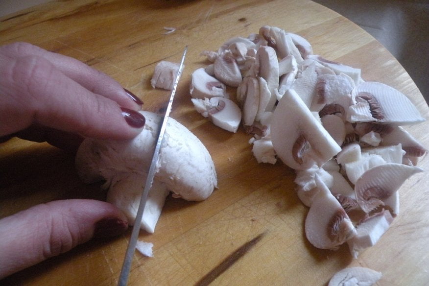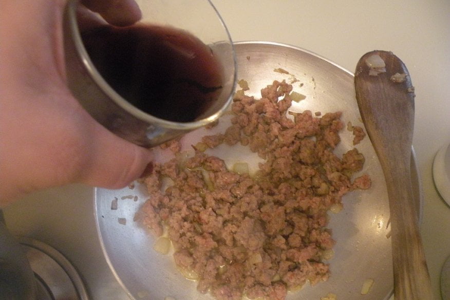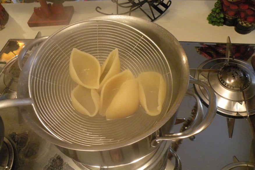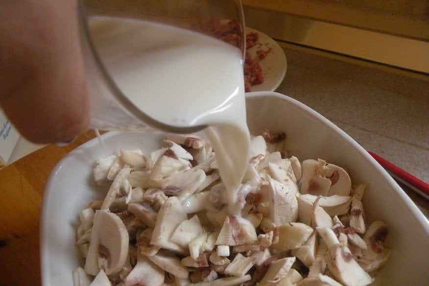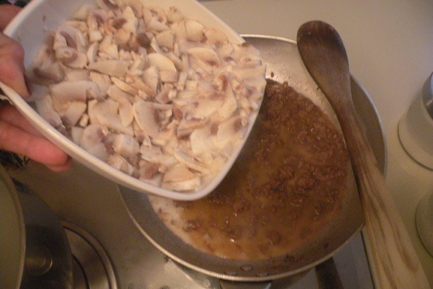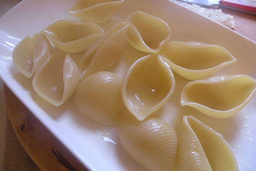 Ingredienti per 2 persone: 100g di conchiglioni grandi (all’incirca 12), 200g funghi champignon, 200g di salsiccia di vitello, 1 bicchiere abbondante di latte, ½ bicchiere di vino rosso, 1 cipolla media, 100ml di besciamella (diluita con un po’ di latte), 2 cucchiai parmigiano, olio, sale, pepe.