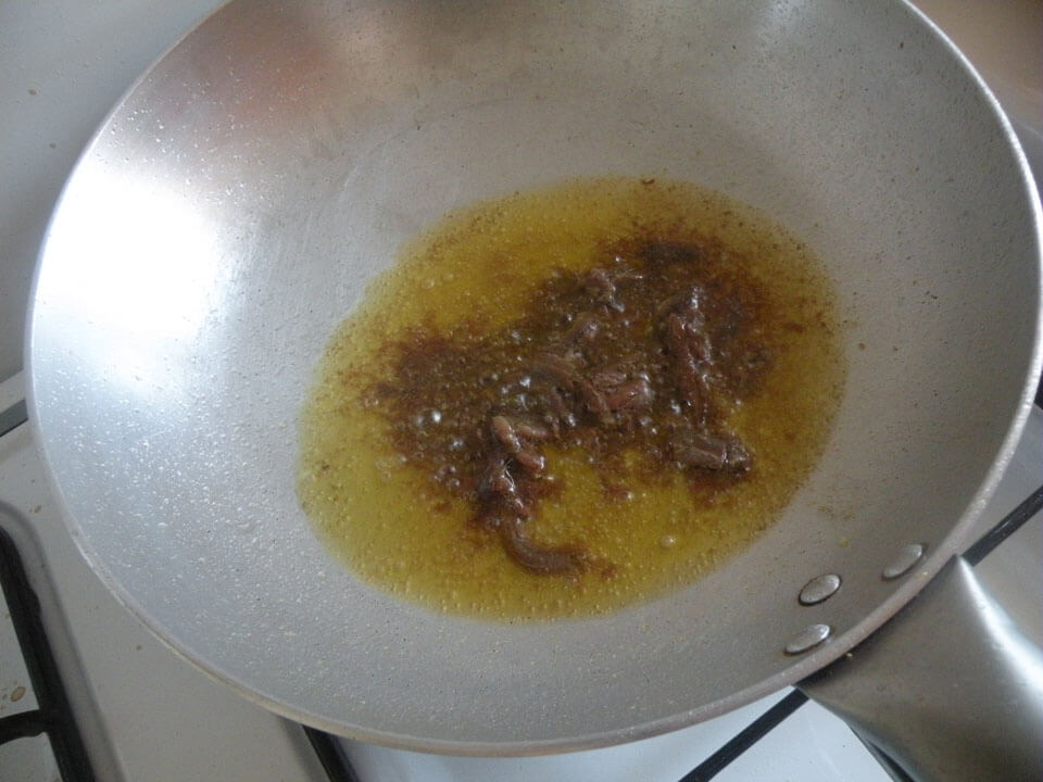 Cominciate col scaldare l’olio in una padella, uniteci i filetti di acciughe e cuoceteli a fuoco basso, fino a quando si saranno completamente sciolti, uniteci l’aglio tritato finemente, il pangrattato e il peperoncino, se lo gradite potete aggiungerci anche del prezzemolo tritato. Cuocete e lasciate insaporire.