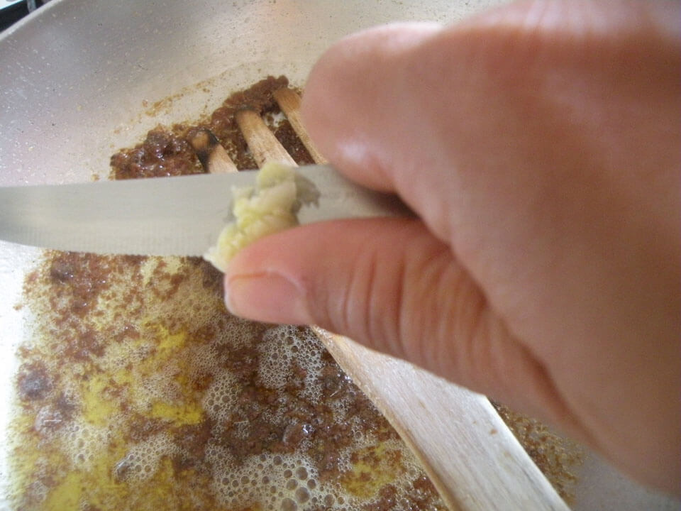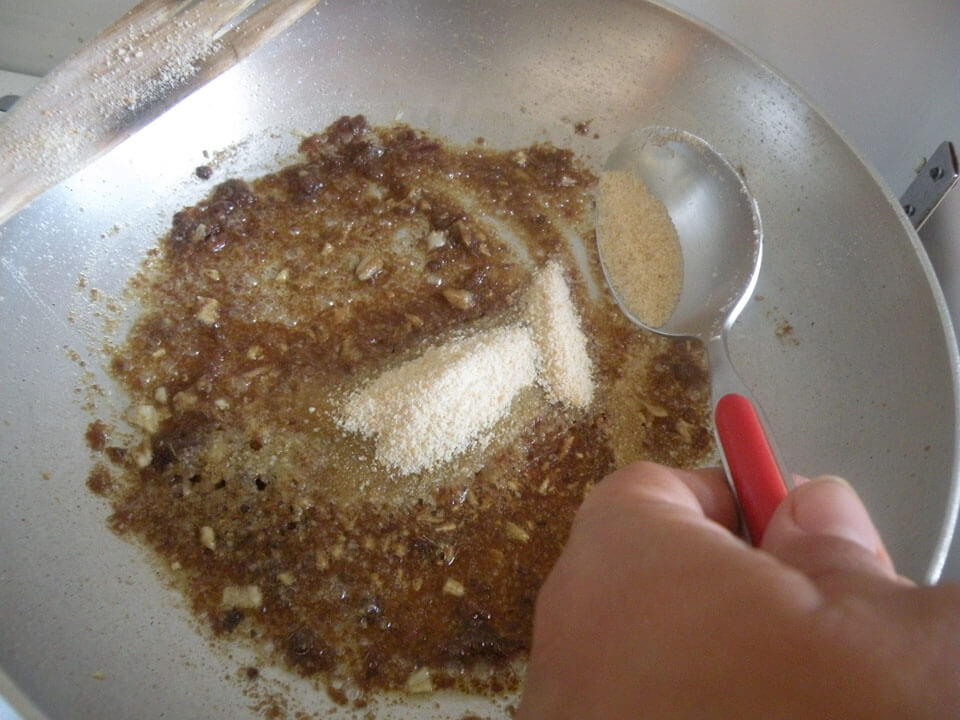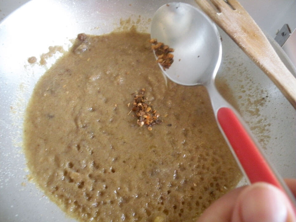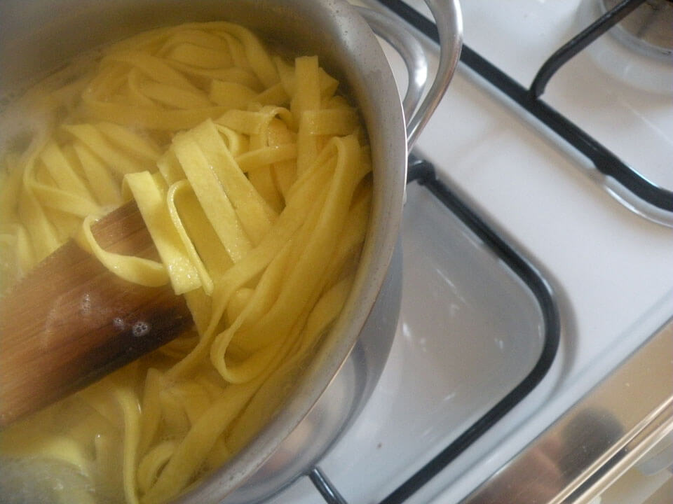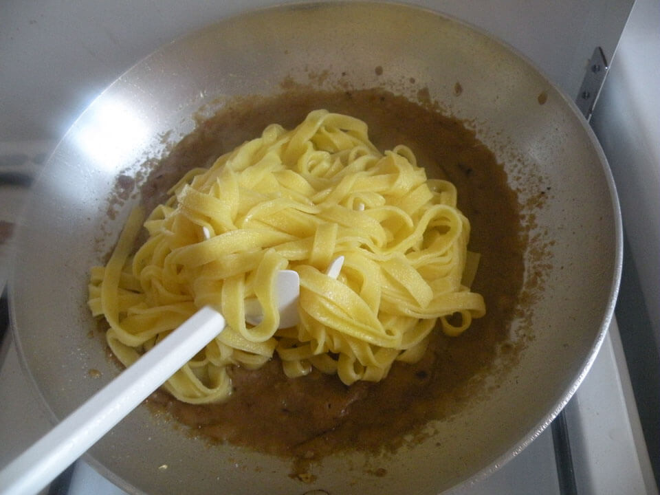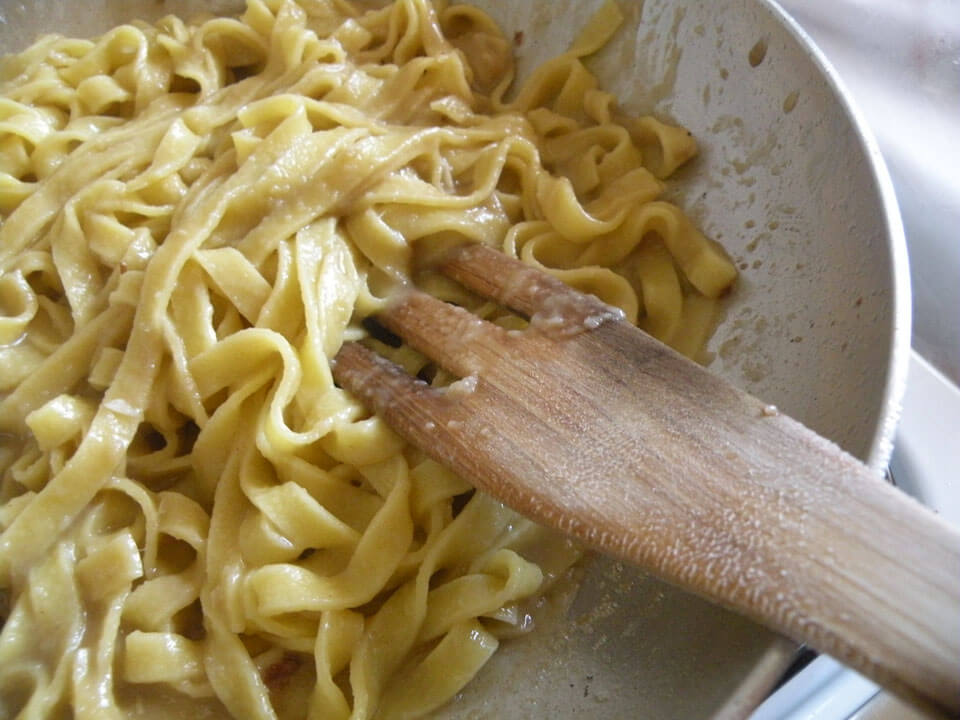 Questo tipo di condimento tende ad asciugarsi facilmente, quindi tenete a portata di mano l’acqua di cottura della pasta che adopererete mentre finite di cuocerla in padella.