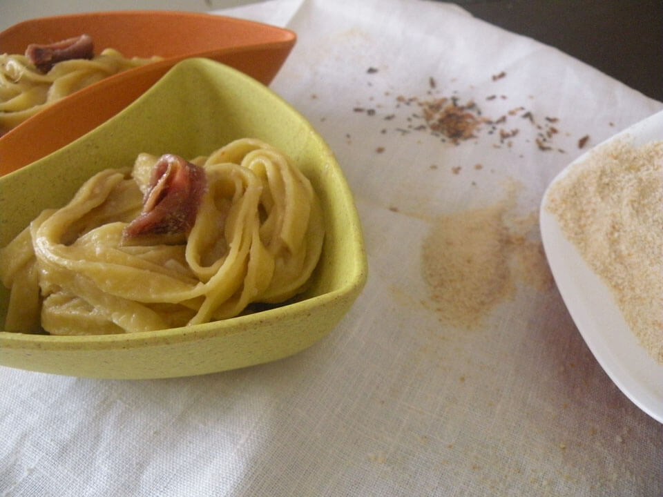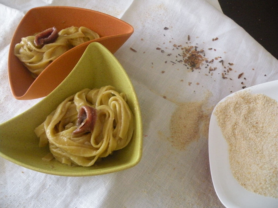 Ingredienti per 4 persone: 300g di fettuccine, un barattolino di alici sott’olio da 80g, uno spicchio di aglio tritato, pangrattato 60g, peperoncino tritato, olio evo.
