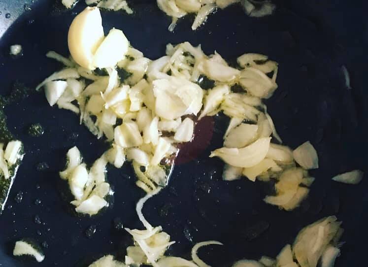 2 Mettete in una padella l’olio, la cipolla tritata e l’aglio schiacciato.