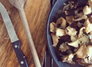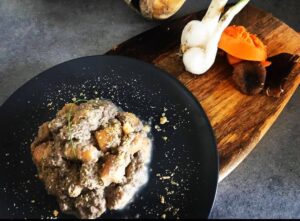 Ingredienti per 2 persone: 500g di funghi cardoncelli, 250g di gnocchi, 40ml di panna fresca o 30 ml di latte, aglio 1, cipolla lunga 1/2, olio, sale, pepe, taralli sbriciolati.