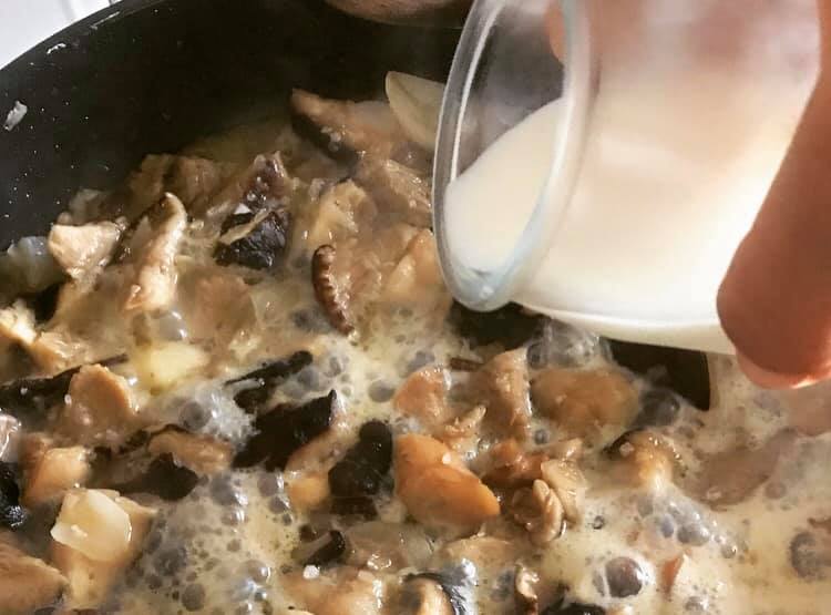 4 Quando i funghi avranno perso la loro acqua, aggiungete la panna fresca o il latte. E fate asciugare a fuoco basso. Salate e pepate.