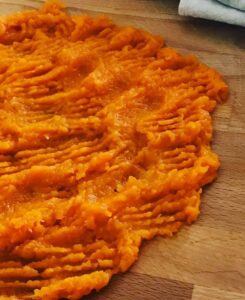 Ingredienti: zucca 500g, farina 300g, farina di semola 100g,  uovo 1, un pizzico di sale.