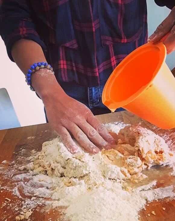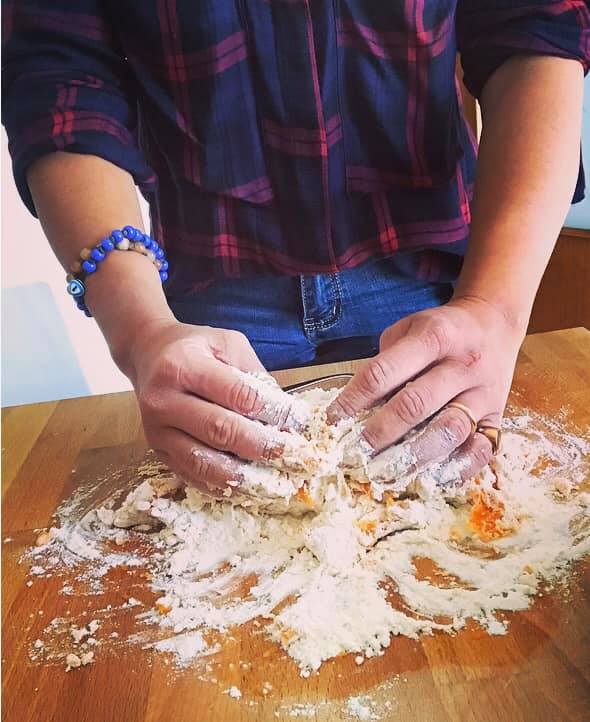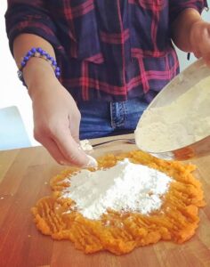 6 Aggiungete un po’ d’acqua, non troppa, la zucca già di suo ne contiene abbastanza. Dovete riuscire a lavorare l’impasto con facilità, dovrà essere ne troppo molle ne troppo dura. Alla fine risulterà morbido ed elastico.