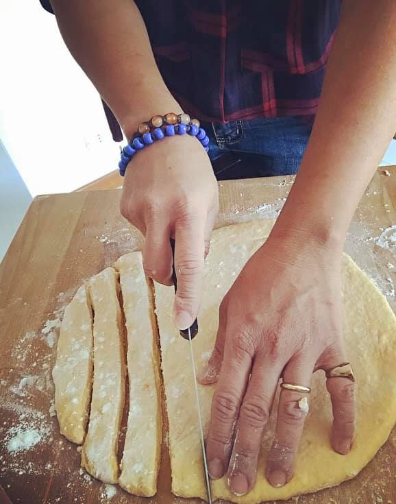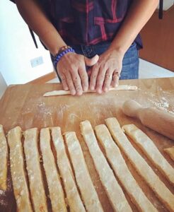 7 Stendete l’impasto in forma circolare dopo averlo fatto riposare per almeno 20min. Dovrà essere non molto sottile. Ora ricavate delle strisce di 2cm di larghezza circa.