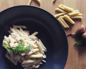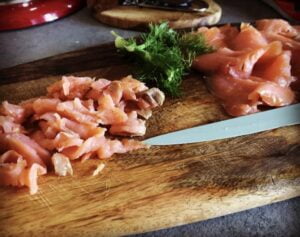 180g di pennette (ti consiglio quelle strette strette “la Molisana” n.22), salmone affumicato 200g, panna da cucina 1 confezione, due scalogni medi, erba cipollina, un bicchiere di vodka(grandezza di quelli di plastica).