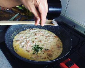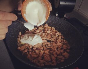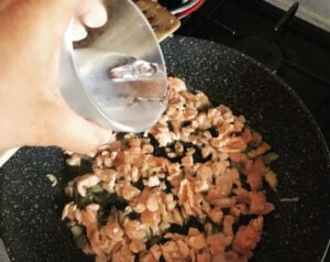 4 Prima che il salmone si sia completamente asciugato, aggiungi la panna e mescola per amalgamare il tutto. Se ce ne fosse bisogno aggiungi un po d’acqua.