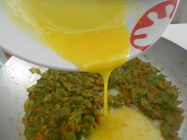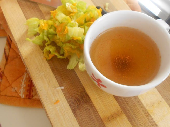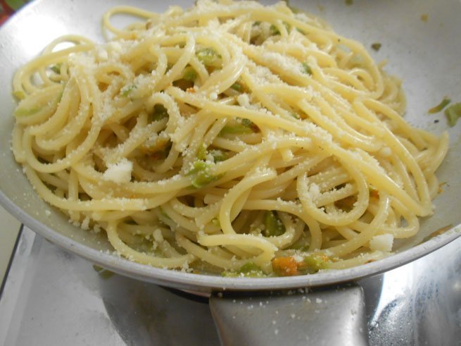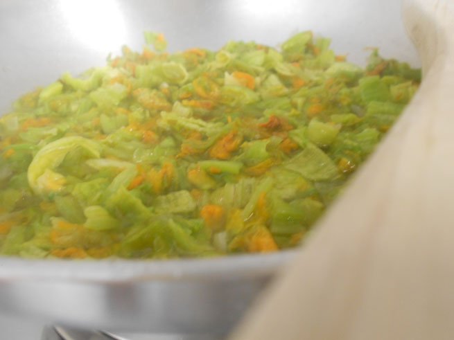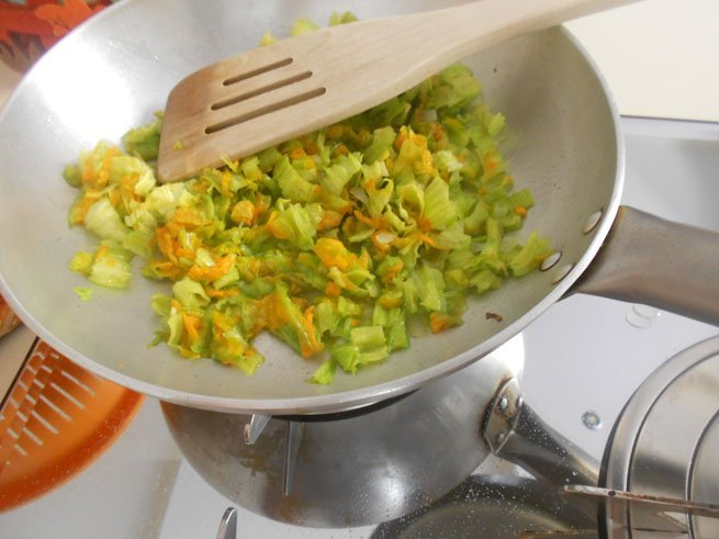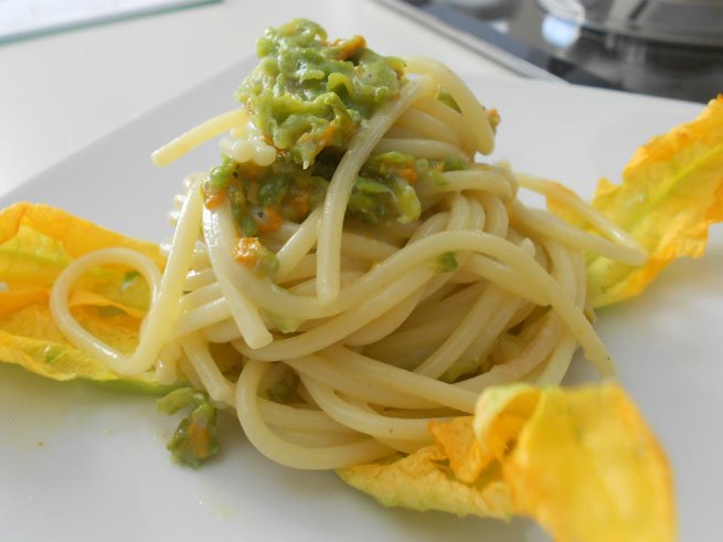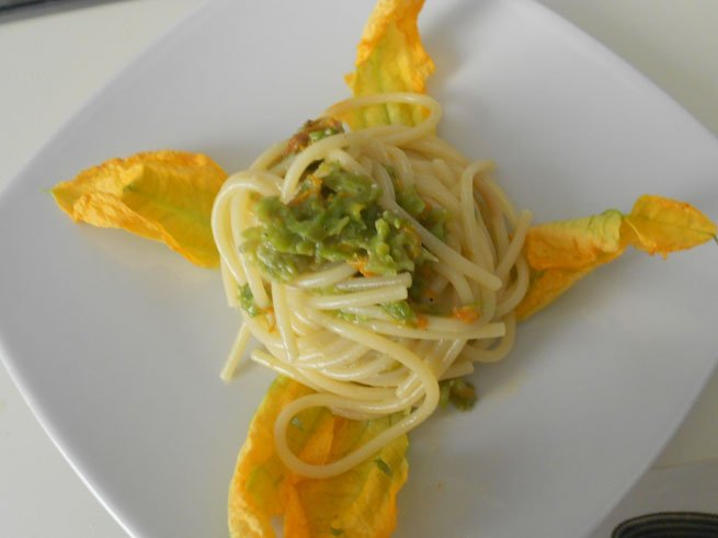 Ingredienti per 4 persone: 400g di spaghetti, 10 fiori di zucca, una cipolla media, due cucchiai di prezzemolo tritato, 6 cucchiai di olio evo, una bustina di zafferano, due cucchiai di pecorino romano grattugiato, un tuorlo d’uovo, sale, pepe.