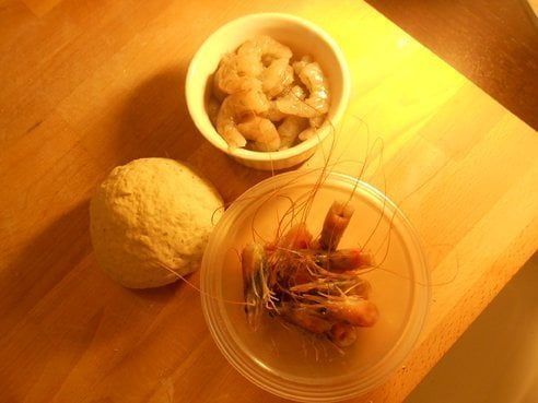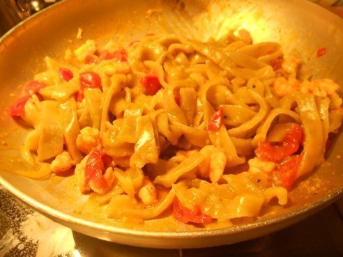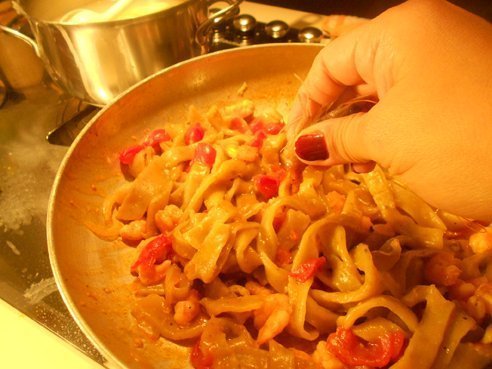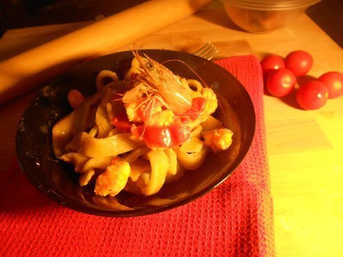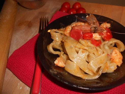 Intanto preparate il sughetto. Sgusciate i gamberi mettendo da parte le teste. In una padella mettete un po’ d’olio e la cipolla tritata, appena si sarà imbiondita aggiungete i gamberi che con delle forbici da cucina avrete tagliato a metà. Aggiungete il vino e una volta evaporato, unite i pomodorini tagliati a tocchetti. Aggiustate di sale, mettete il pepe e lasciate cuocere per 15 minuti ancora aggiungendo poca acqua se il sugo dovesse asciugarsi troppo. Mettete abbondante acqua salata sul fuoco e nell’attesa che cominci a bollire, stendete il panetto di massa formando un disco molto sottile, durante la stesa infarinate spesso. Ottenuto il cerchio di pasta arrotolatelo su se stesso e poi con un coltello tagliatelo a strisce. Con le mani infarinate aprite quelle strisce e avrete ottenuto i vostri tagliolini che disporrete ben aperti e ben infarinati. Appena l’acqua bollirà, versate all’interno un filo d’olio e subito la pasta fresca. Dopo qualche minuto sarà pronta, scolatela, tenendo da parte l’acqua di cottura e mettetela direttamente nel sugo dove, a fuoco vivo salterete il tutto perché si amalgami. Infine un tocco da chef imparato durante un corso al Gambero Rosso. Prendete le teste dei gamberi che avete precedentemente messo da parte e spremetele sulla pasta, finito questo passaggio, mescolate ancora aggiungendo un po’ d’acqua di cottura, quasi a mantecare e servite. Vi assicuro che quest’ultimo passaggio è ciò che da quel salto di qualità al piatto.