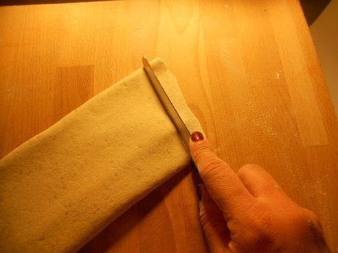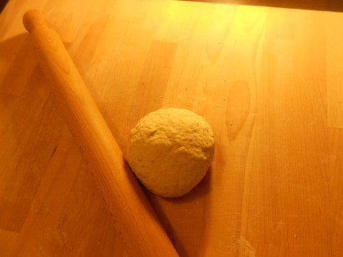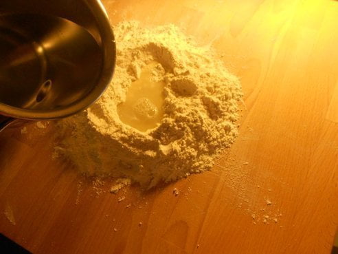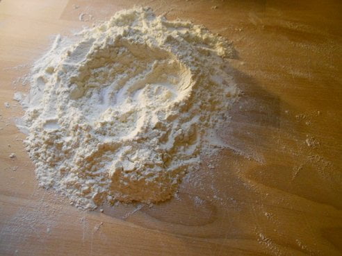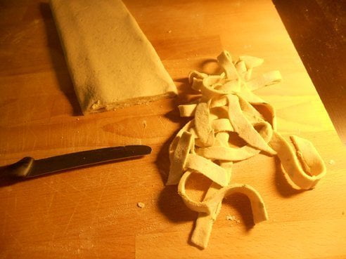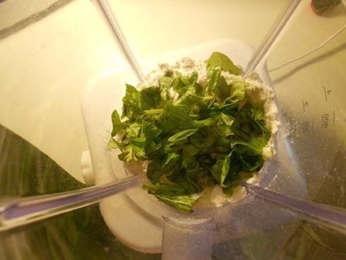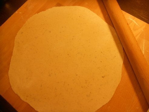 Preparate la pasta mettendo metà della farina in un frullatore insieme alle foglie del basilico e frullate insieme. Appena le foglie si saranno sminuzzate, incorporate su di una spianatoia con l’altra metà della farina e aggiungendo poco alla volta acqua tiepida, impastate. Alla fine dovrete ottenere un panetto compatto ed elastico. Mettetelo a riposare per 20 minuti circa.