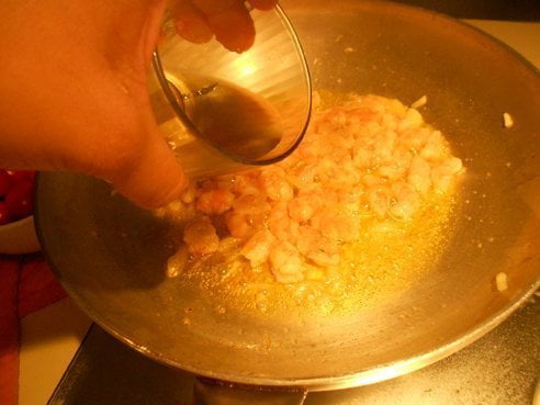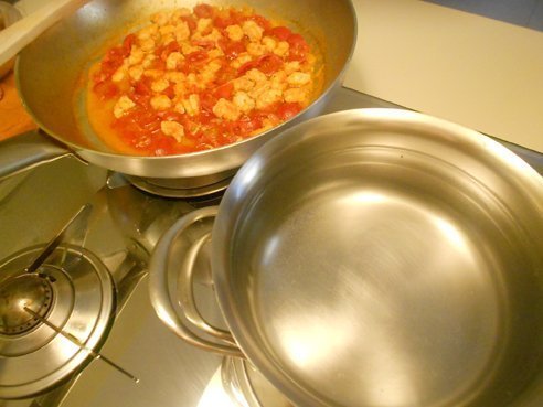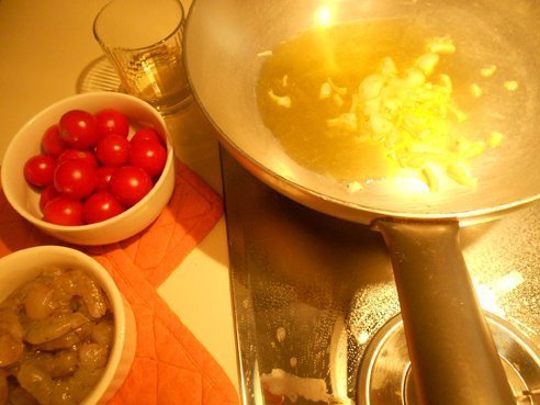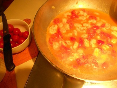 Il sughetto: gamberi freschi 500g, pomodorini pachino medi 10, mezza cipolla media, mezzo bicchiere di vino bianco, olio, sale, pepe.