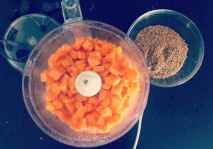 02. Ora pulite e tagliate a cubetti la zucca e anch’essa mettetela nel mixer per ridurla in purea.