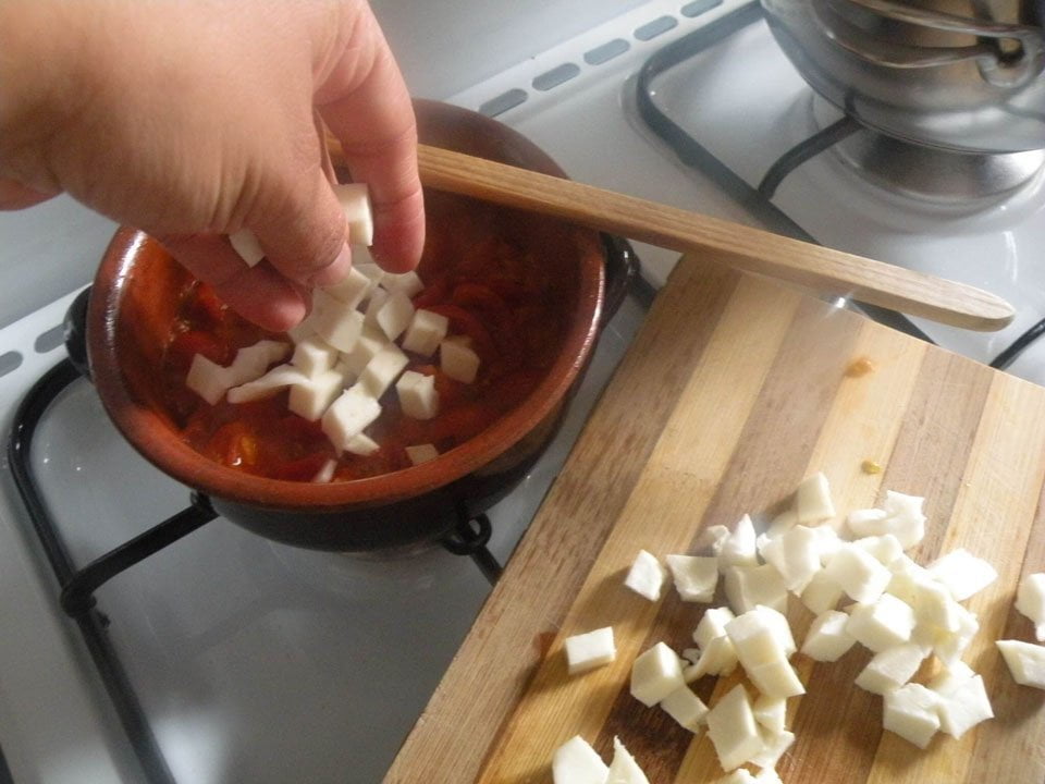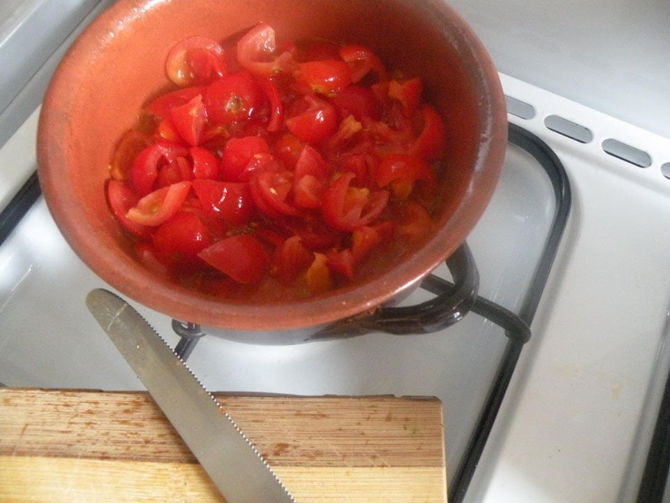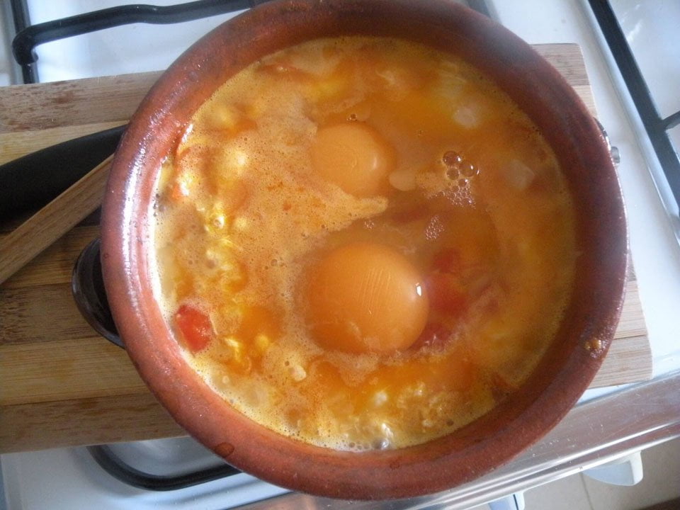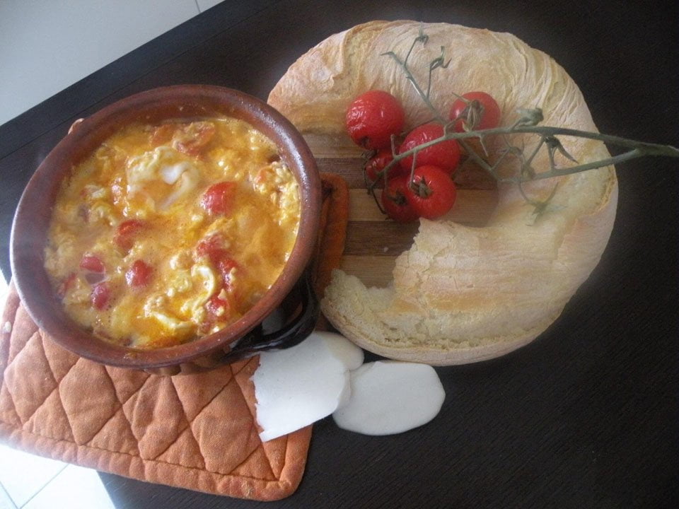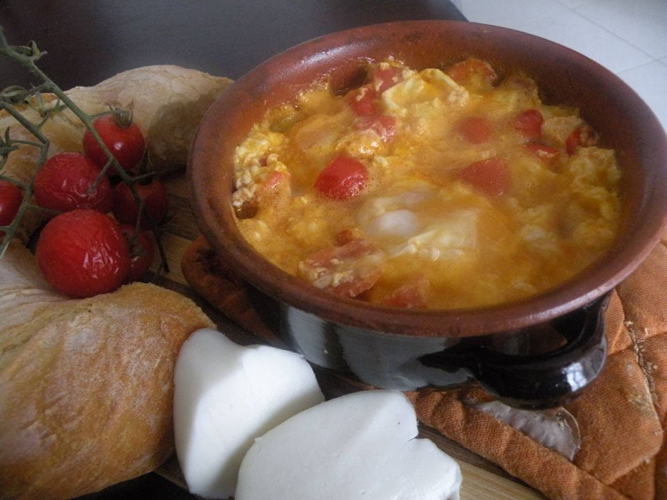In una terrina di creta metteteci poco olio e appena caldo aggiungete la cipolla finemente tritata, fatela imbiondire e poi versate i pomodorini tagliati a tocchetti piccoli, aggiungete poca acqua e fateli cuocere, devono ammorbidirsi del tutto. A questo punto aggiungete la scamorza tagliata anch’essa a tocchetti, aspettate che si sciolga e rompete all’interno le due uova. Aiutandovi con una forchetta e stando attenti a non rompere i tuorli, mescolate delicatamente l’albume per far sì che cucini completamente. Salate e quando ancora il tutto è ancora umido spegnete il fuoco e gustate questo spettacolare piatto caldo e, neanche a dirlo, con dell’ottimo e fragrante pane. Inutile dirvi che il giorno in cui deciderete di deliziarvi con questa ricetta dovrete mettere al bando qualsiasi dieta o piano alimentare; l’unico vostro obiettivo sarà il piacere, il gusto,mettete l’acceleratore ai vostri sensi, alle vostre papille gustative…assaporate il momento, l’ora, al domani c’è sempre una soluzione.