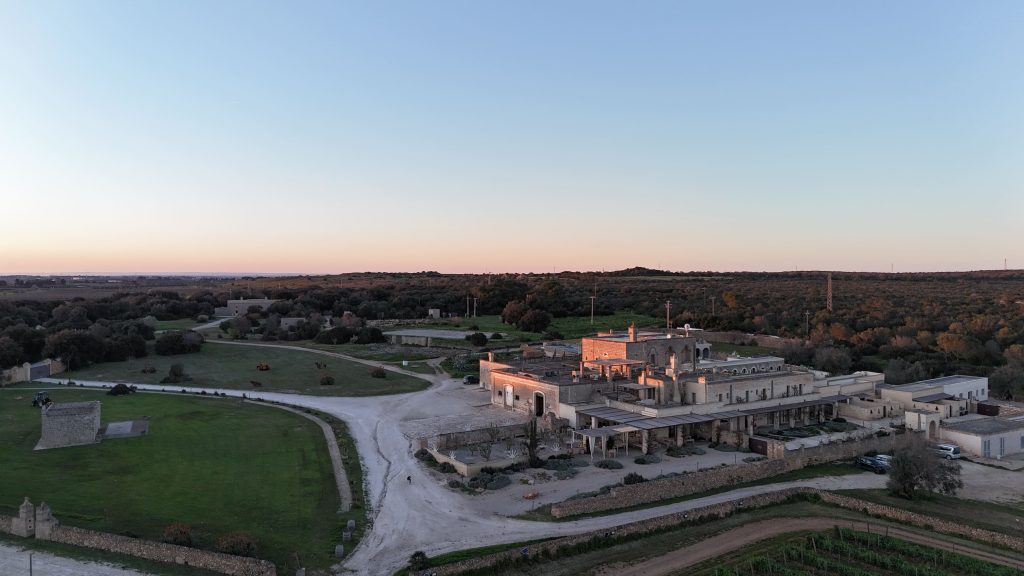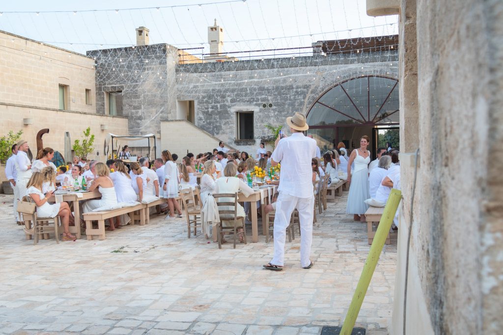 Quando il sole cala, il banchetto comincia. Piatti semplici, ingredienti raccolti dagli orti della masseria, profumi che si mescolano e danzano tra i tavoli. I vini scelti con cura scorrono nelle coppe, e ogni sorso sembra raccontare il territorio, la storia, la fatica e la bellezza della terra. Non serve dire che è speciale: lo si capisce dai sorrisi, dai silenzi, dai brindisi che esplodono nel crepuscolo. E poi la festa. Non è rumorosa, non è ostentata. È un movimento naturale, fatto di passi, di mani che si cercano, di occhi che ridono e brillano.