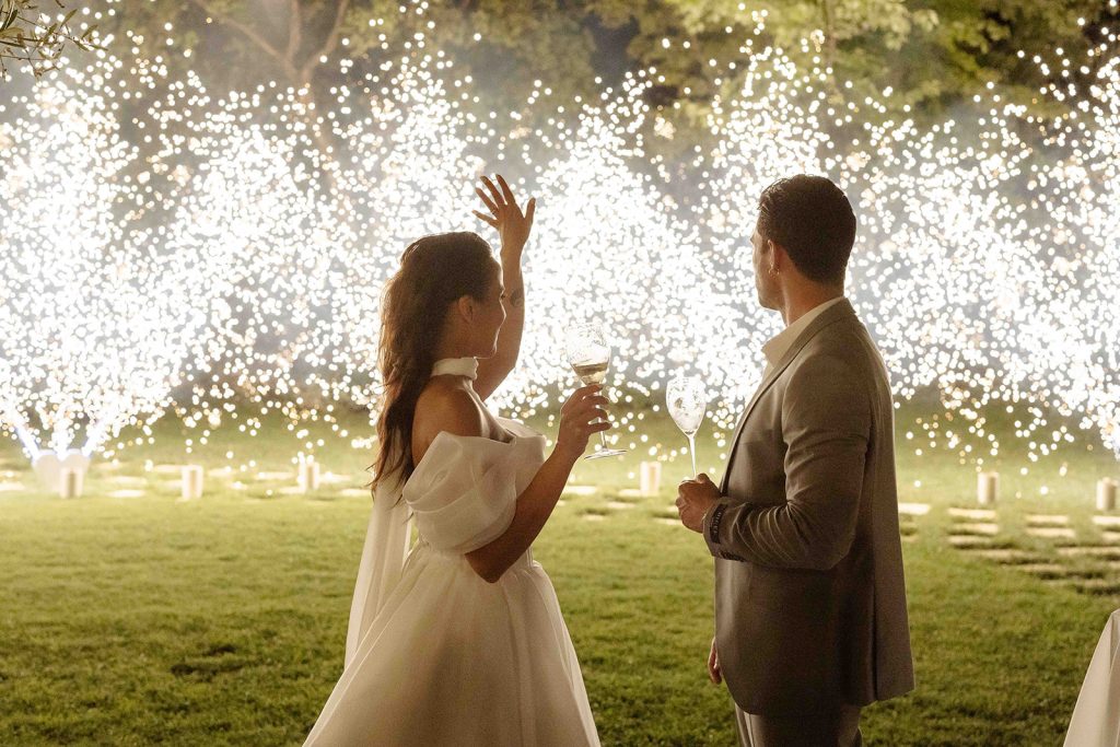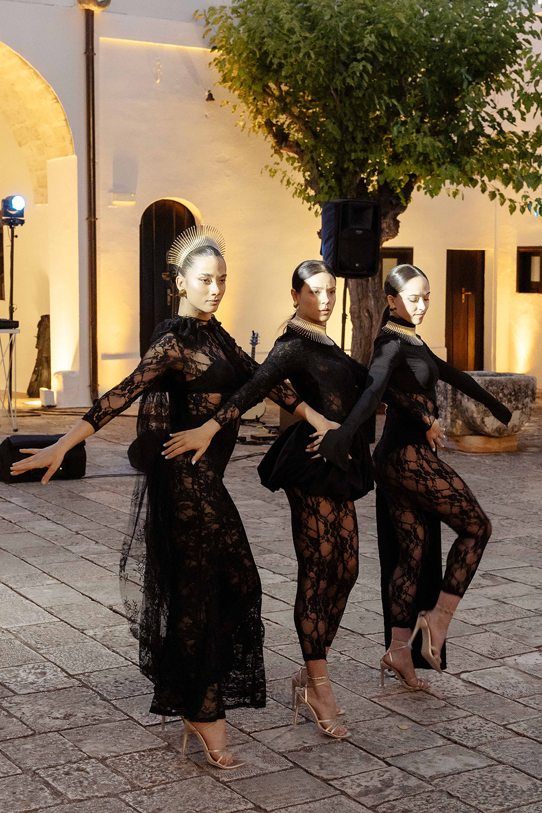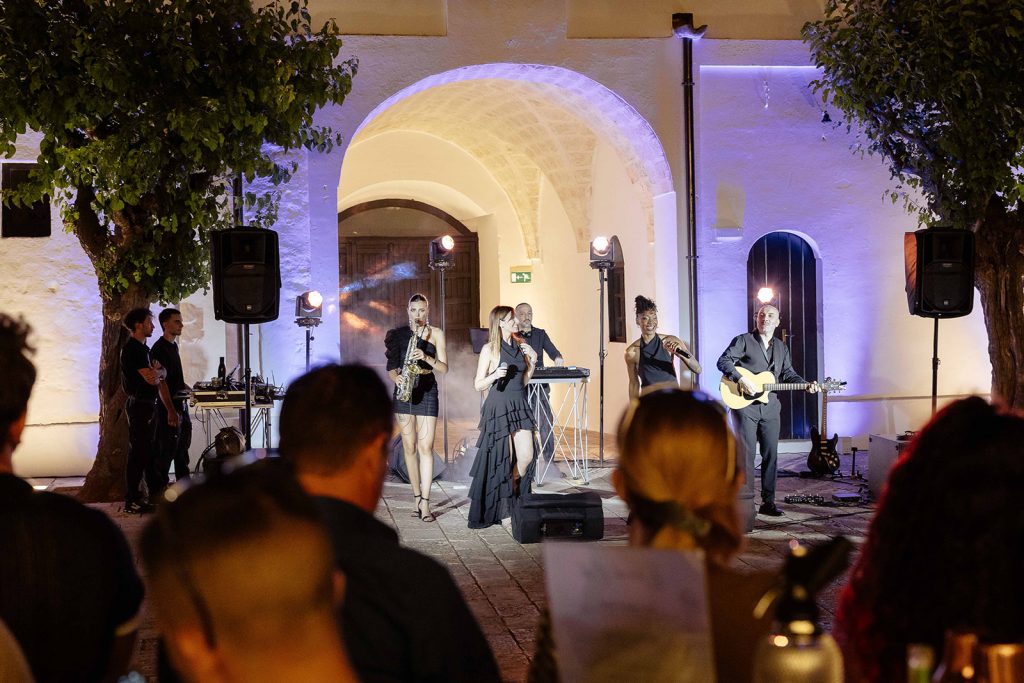 Uno dei gesti più simbolici della serata è stato togliere il tavolo degli sposi. Un gesto semplice, ma potente. Perché ha stravolto la logica dell’evento formale e l’ha trasformata in una grande festa tra amici. Gli sposi erano liberi di muoversi, chiacchierare, condividere. Di vivere. E poi musica dal vivo, performance studiate per coinvolgere e sorprendere, un menù che non era una maratona gastronomica, ma un percorso sensoriale, una narrazione di sapori locali pensata per stimolare i sensi, non solo per riempire piatti.