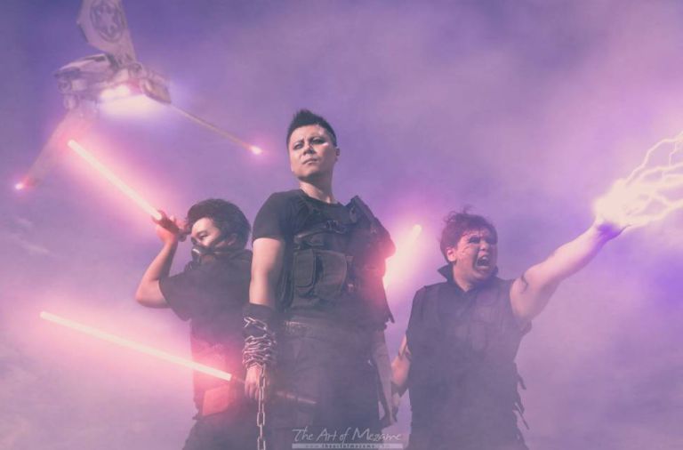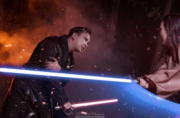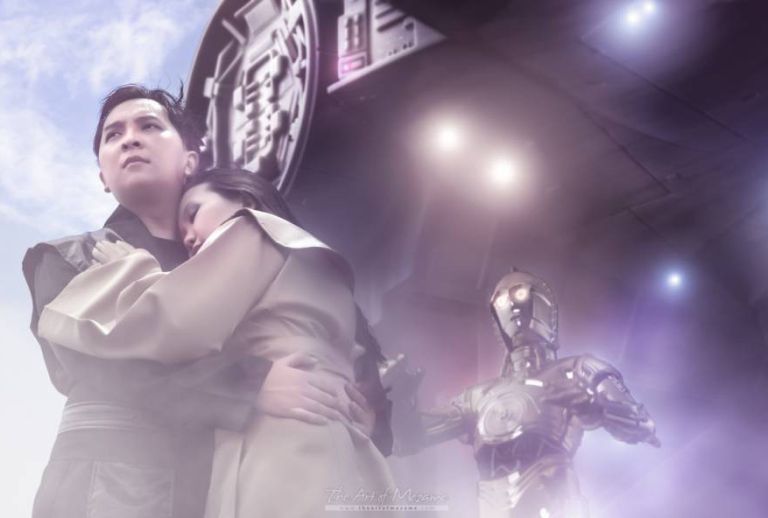 Per la serie “no limits”, Adrian e Adeline due fan di Star Wars hanno deciso di sposarsi con un servizio fotografico che fosse fuori dall’ordinario, rendendo omaggio al loro film preferito. Si sono così rivolti a Mezame Shashin-ka, fotografo di Singapore, che ha realizzato per loro un album fotografico che li ritrae come due cavalieri jedi innamorati uno dell’altro. Ma non si tratta di semplici pose, il fotografo, autentico appassionato di sci fi, ha rilanciato proponendo ai due sposi una sorta di trama epica che li ritraesse da protagonisti. Prima delle riprese ci sono volute settimane per progettare e realizzare spade laser artigianali e modelli astronavi. Ma Adrian e Adeline non sono gli unici. Ogni giorno la collezione di album fotografici di di coppie desiderose di sperimentare e divertirsi si arricchisce di nuovi contributi sempre più estrosi e creativi. Come l’opera di Quinn Miller che vede una coppia di sposi, James Lowder e Katie Young, uniti dalla passione per il mondo giurassico, fuggire urlanti inseguiti da un gigantesco lucertolone. Immagine che a sua volta ha ispirato i fotografi di Toronto Danielle e Tony Lombardo di Littel Blue Moon, nella costruzione dell’opera che vede Leslie Seiler e Paul Kingston, una coppia prossima alle nozze correre in testa al gruppo di amici, per non finire tra le zampe metalliche di tre AT-AT. I veicoli corazzati di Star wars. Alla fine si ritorna sempre lì, alla fantascienza. Perché il matrimonio cosa credete che sia?