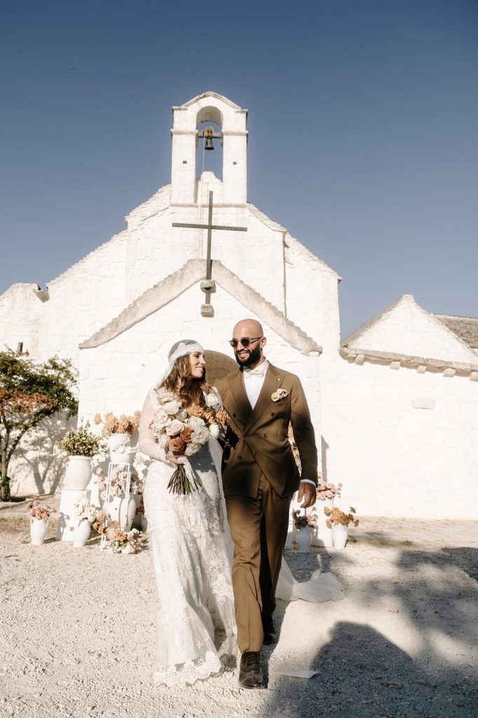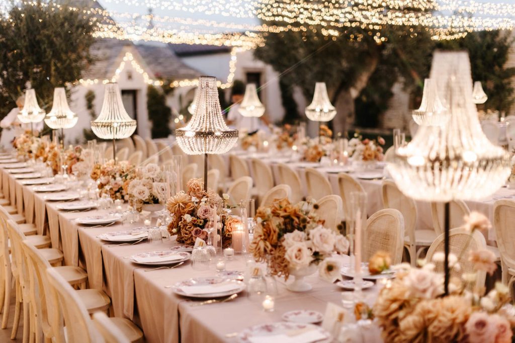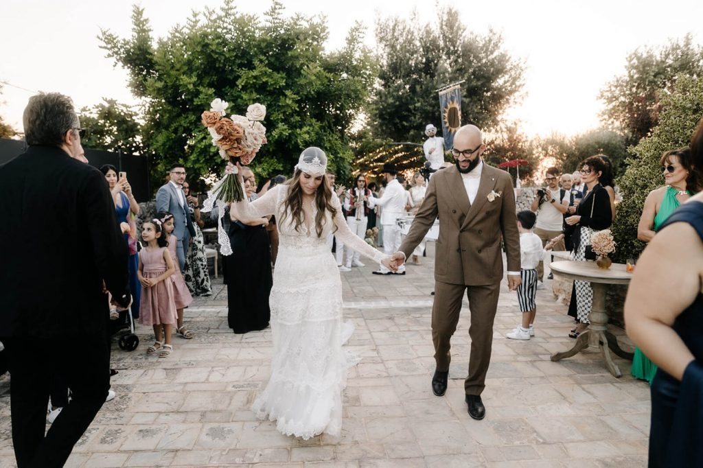 Insieme alla wedding planner Giulia Molinari, ha dato vita ad un evento originale e raffinato, senza mai rinunciare alla calda accoglienza e all’atmosfera familiare che contraddistingue la Puglia. Invece di seguire il classico percorso che portava all’interno della masseria, è stato studiato un itinerario più dinamico e coinvolgente. L’area d’accoglienza è stata allestita in un luogo insolito, che è servito a creare un nuovo spazio intimo e riservato. Gli ospiti, accolti dalle note dolci di un quartetto di violiniste si sono sentiti subito avvolti dalla magia. L’arrivo degli sposi ha avuto poi un cambio di registro con l’esibizione dei Pheel Balliana. Una ventata di allegria e festa ha accompagnato gli ospiti nell’area dedicata alla sagra con food corner di cibo tipico pugliese. Altro spostamento nella zona più antica della masseria vicino al trullo per la cena. Qui lunghe tavolate imbandite con cura hanno accolto gli invitati, che hanno potuto ammirare il cielo stellato mentre gustavano le prelibatezze preparate dallo chef. Ogni dettaglio, dalla tovaglia ricamata con le iniziali degli sposi alla scelta dei fiori, raccontava una storia d’amore unica.