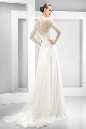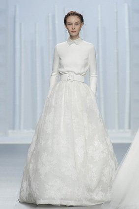 Easy ed informali con grandi ambizioni metropolitane sono le spose del trend “Volevo i pantaloni”. Per (16) Houghton Bride sfilano pantaloni a vita altissima che slanciano la figura con connotazioni boho-chic, mentre l’azienda spagnola (17) Inmaculada Garcia, nella linea My secrets, riesce a rendere diva il lungo pantalone in pizzo attraverso una sofisticata coda plissettata. Pantaloni bianchi anche per Carolina Herrera (18).
