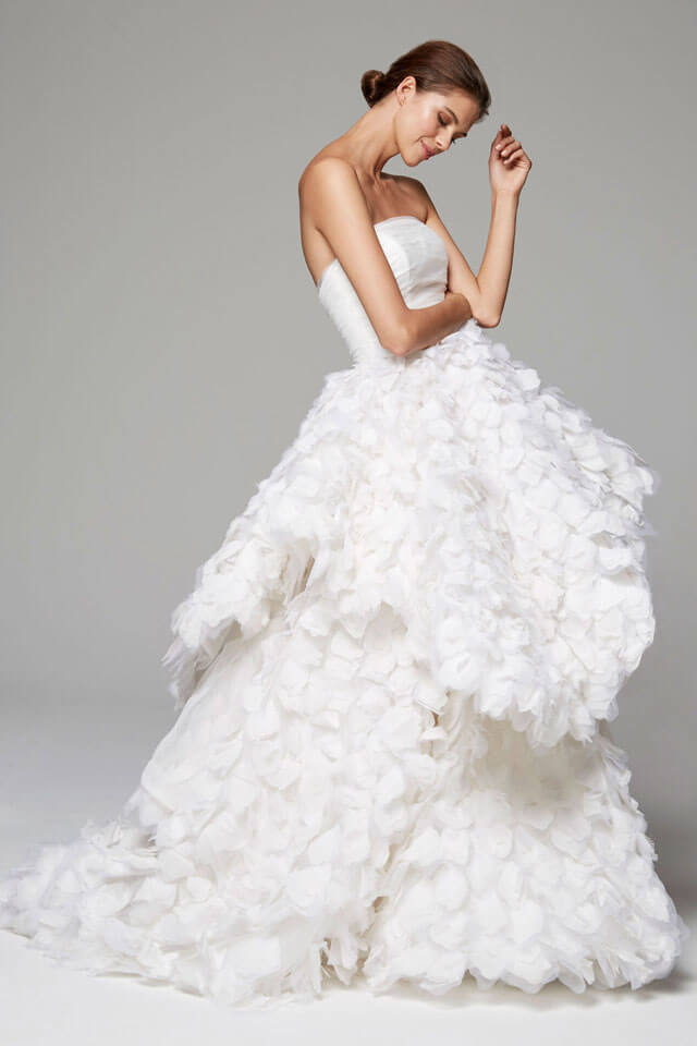 La sposa di Marchesa è donna forte e sicura di sé. Indossa abiti elegantissimi da gran soiree, impalpabili come piume e resi unici da drappeggi e decorazione floreali.