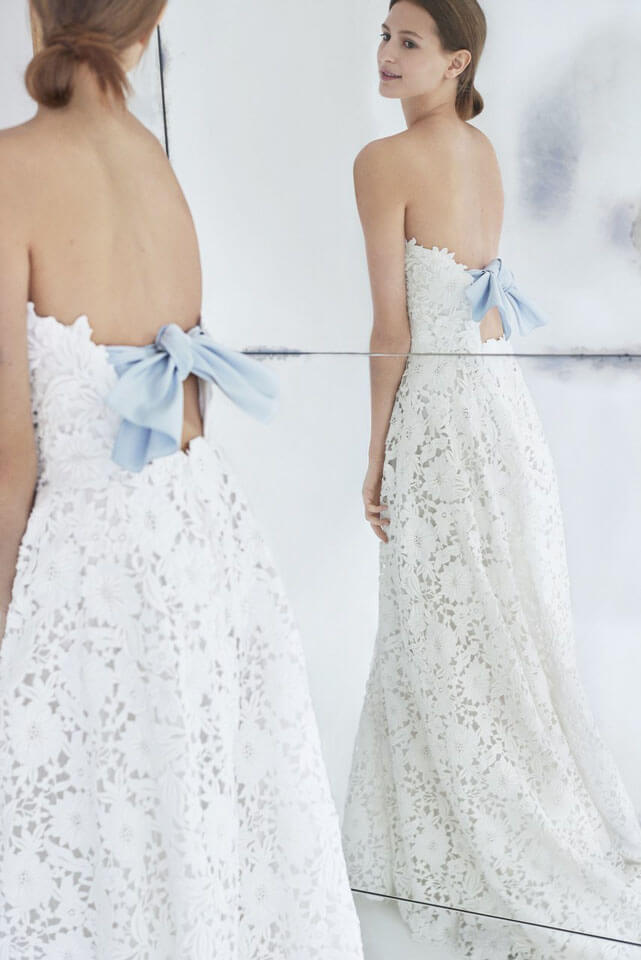 Molto tradizionale e romantica la collezione di Carolina Herrera caratterizzata da fiocchi sulla schiena e decorazioni floreali.