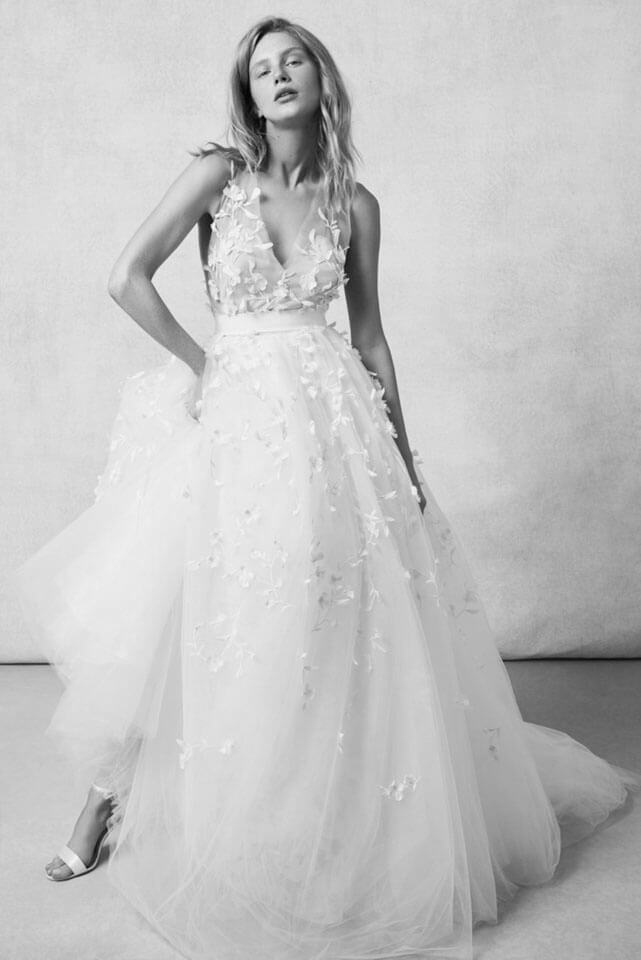Strati di tulle e ricami floreali per la sposa bohémien dello stilista giapponese Tadashi Shoji.