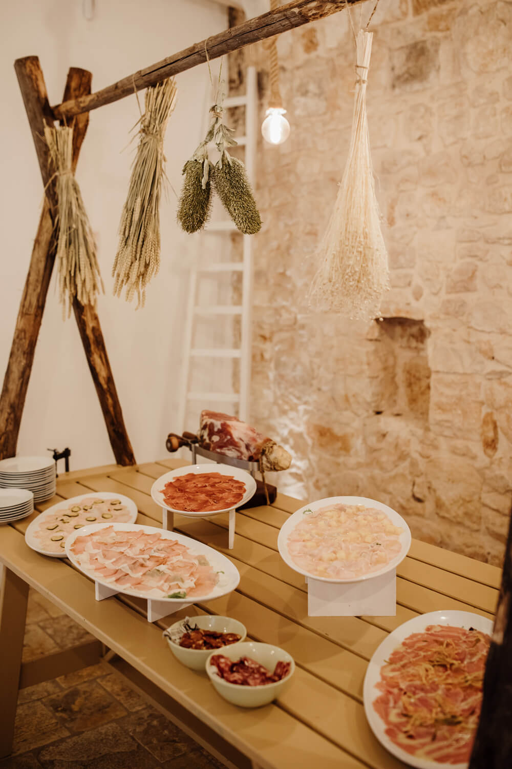 L’uliveto, che si estende per ettari intorno alla masseria, è una cornice naturale incantevole per la celebrazione del rito civile o per un romantico scatto fotografico. L’elegante fienile, invece, è l’ambiente ideale per ospitare il ricevimento, con la sua struttura in pietra bianca e i dettagli rustici che creano un’atmosfera calda e accogliente.
