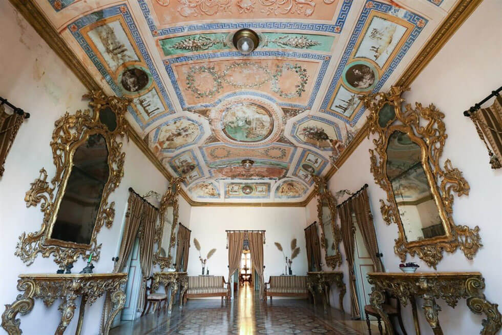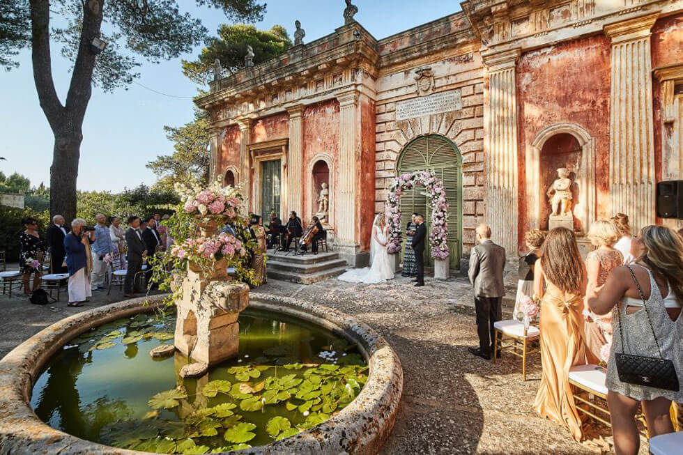 È possibile infatti celebrare matrimoni che spaziano dalle antiche sale che collegano i prati dell’ingresso monumentale, con il verde del giardino, alla chiesa tuttora consacrata, al terrazzo fino al padiglione del museo che ospita i reperti archeologici della collezione Meo Evoli. Così come si possono organizzare eventi a bordo piscina o all’ombra di eleganti gazebo. Il matrimonio di M e J è stato un sogno: un semplice arco di fiori, davanti al museo, un quartetto d’archi e sedie dorate.