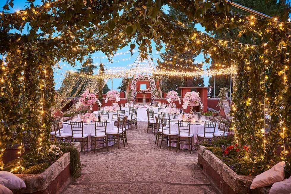 Tutto declinato nei toni del rosa e dell’oro, come gli antichi mobili all’interno della villa. Il terrazzo è stato “vestito” con un pergolato di edera e mini luci per creare un effetto caldo per il ricevimento.Fiori, candele, mini lucciole hanno reso fiabesca la cena. La villa con i suoi giardini a fare da meravigliosa cornice.
