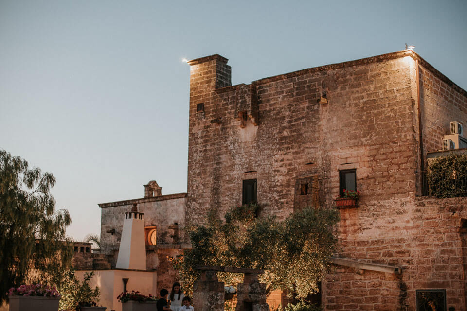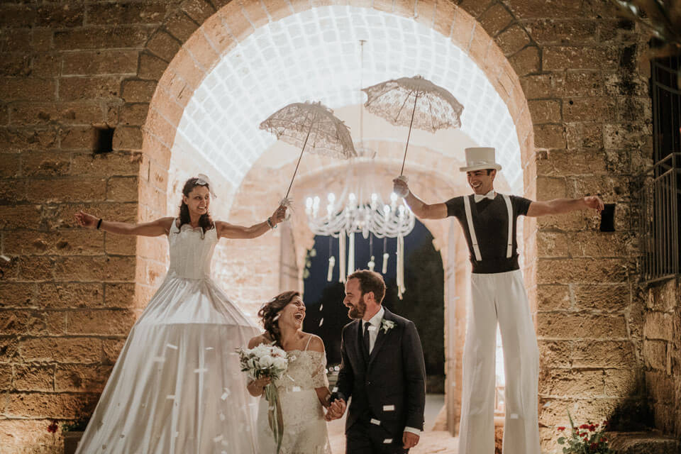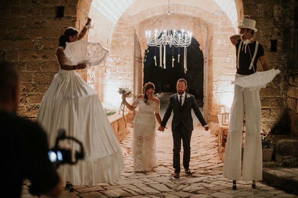Atteso dagli invitati e accolto con un appaluso, ecco l’arrivo a corte degli sposi cui dà un tocco di freschezza e originalità l’accompagnamento della travolgente, gioiosa musica della Bedixie, street band e l’evanescente pioggia di petali che una coppia di splendidi Trampolieri Girovaghi, lascia cadere al loro passaggio attraverso il possente magnifico ingresso. La tipica corte del XV sec., dall’antico basolato che conserva i segni del passaggio delle carrozze e dei carriaggi, accoglie la coppia e fa da cornice all’aperitivo di benvenuto, a cui dona un particolare charme fatto di eleganza, tradizione e intimità.