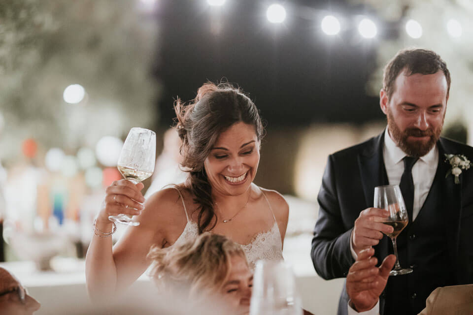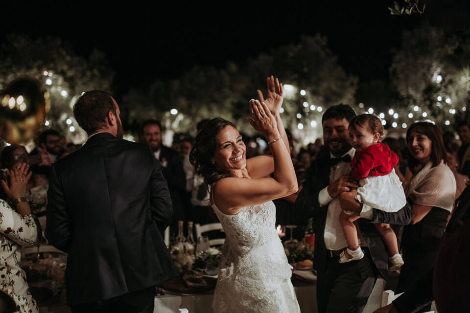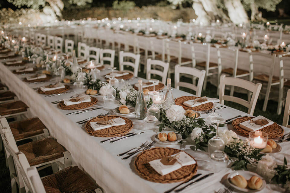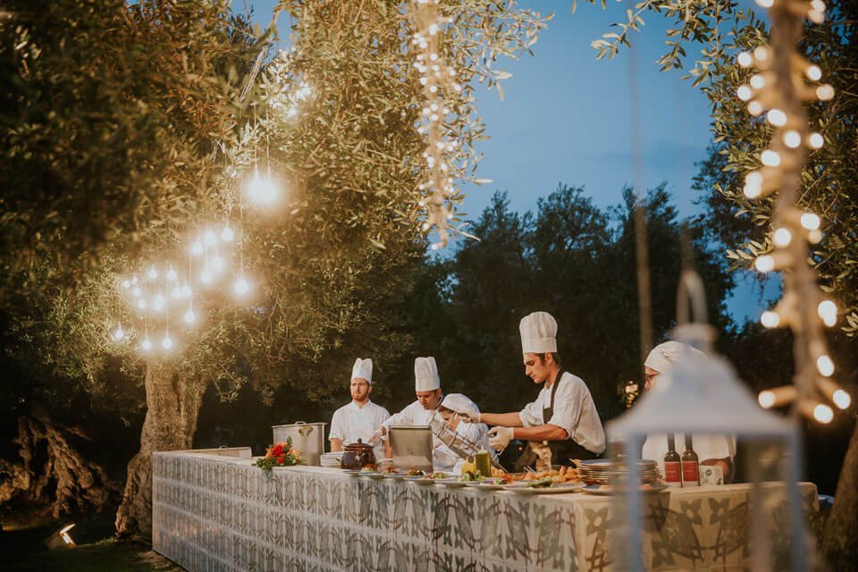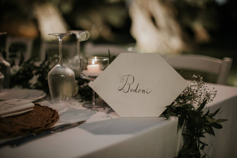 A sollecitare il gusto ed esaltare la convivialità l’accattivante fusione di profumi antichi e modernissimi: quello inebriante che la terra regala di sera si unisce all’aroma del cibo, alla musica di sottofondo e alle gioiose conversazioni, in un mix sempre inedito. Un brindisi alla felicità degli sposi prima di entrare per la cena nuziale nell’uliveto secolare, accolti da un originale tableau de mariage, personalizzato per l’occasione con i simboli della scrittura e dell’arte tipografica: un’antica macchina da scrivere, grandi cliché, cassette per caratteri.