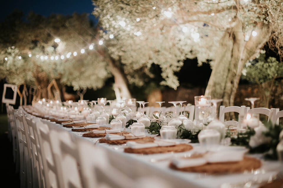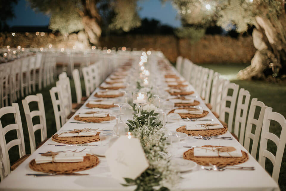 Ed ecco la cena sotto le stelle nell’incanto della scenografica, imponente tavolata, perfetta per il numero di invitati, che ricorda tradizionali feste di campagna in stile british,. I tavoli, siglati ciascuno con il nome di un carattere tipografico: Nebiolo, Elzeviro Bodoni, Corsivo Inglese, Bembo, Monothype, sono magistralmente disposti a staffa sul grande prato, circondati dalle sculture naturali degli ulivi secolari, abbelliti da sedie “campagnole” e dal tocco magico delle eleganti, delicate composizioni floreali di Rollo fiori; nei toni bianchi e verdi con nuvole di leggiadra nebbiolina e esaltano il candore delle tovaglie e una mise en place raffinata e insieme dolcemente country (o rural).