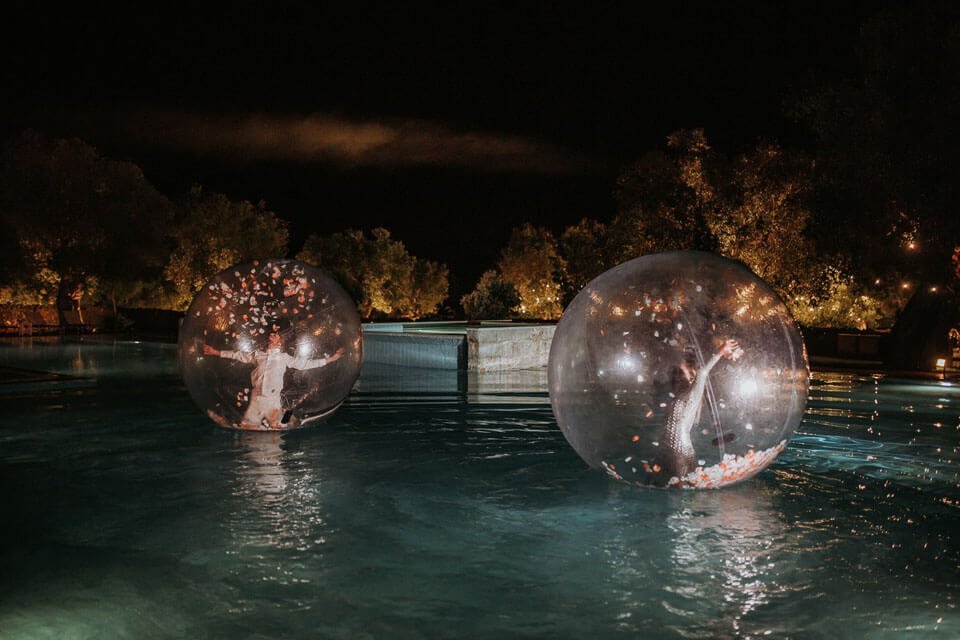 È il momento solenne del taglio della torta. Mani abili e amiche hanno plasmato una spettacolare Wedding cake, tripudio di bontà e architettura di panna e pasta di zucchero che entra in scena nello spazio intorno alla piscina, abbracciata anch’essa dagli ulivi secolari. e palcoscenico della performance di artisti che si muovono con plastica eleganza nella trasparenza di immense bolle a galla sull’acqua:immagine di bellezza da togliere il fiato.