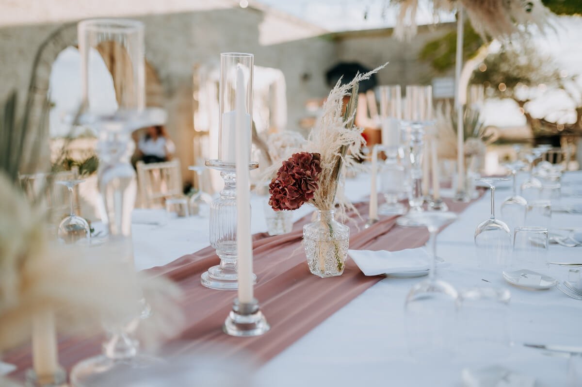 Candele e candelabri per diffondere una luce soffusa e accogliente, quasi intima e perfetta per esaltare l’atmosfera. Un grande tavolo rettangolare per ottenere un effetto conviviale e coinvolgente per parenti e amici, in modo da farli sentire a casa, in una masseria molto naturale con un estetica informale ma comunque ricercata ed elegante.