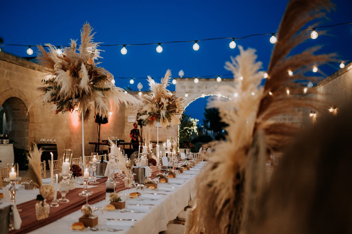 Per la scenografia floreale, ampio spazio alle pampas e ad altri fiori su gradazioni diverse di colore e forma.
